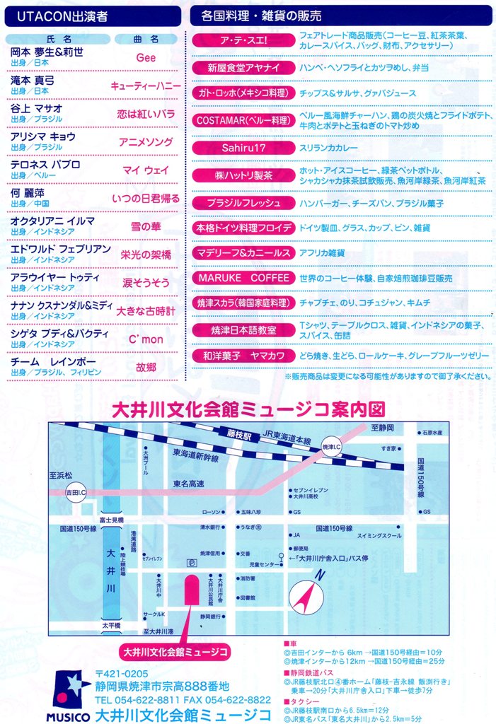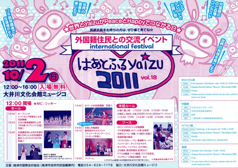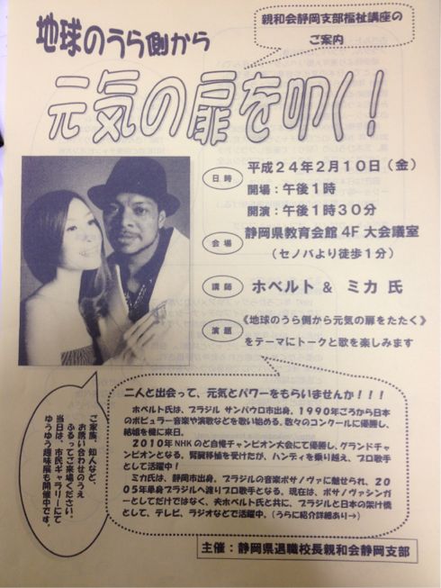 お寺さんでの演奏です♪ また東日本大震災復興支援の為、募金箱を設置いたします。 会場:林叟院 静岡県焼津市坂本1400 開場15:30 開演16:00 出演 ホベルト・カザノバ ミカ・ダ・シルヴァ 樽井 直美(ヴァイオリン) 佐々木優樹(ギター) 中司 和芳(ベース) 入場無料となっております。 また、駐車場はございませんので、ご了承ください。 ※問い合わせ等は、メールにてお願いいたします。 mikamochizuki@hotmail.co.jp ♪10月24日(月)静岡FM Hi 76.9!「静岡昼ラジ情報館」出演。 12:30分頃の出演になります。 オリジナル曲や日々のあれこれをお届けします。 リクエストやメッセージはこちらからになります。 ↓↓クリック↓↓ http://www.fmhi.co.jp/program.php?duqwy=0&pcd=2&PHPSESSID=ujdm1vo4d3j1qe21kb44ihn969v148md ♪10月30日(日)GINZAシャル ハローウィンパーティー出演 会場:GINZA シャル 〒420-0817 静岡市清水区銀座13-27-2 TEL 054-376-4180 ※JR新清水駅より徒歩8分 近くに有料駐車場あります。 1部 10:00~15:00 子供向け、ハローウィンデコレーションワークショップ 入場無料 (演奏も子供向けの踊りなどが中心となります) 2部 18:00~21:00 (演奏は19:00~と20:00~の予定) 大人対象 会費¥2500(1品持ち寄りしてくださった方は¥2000) 出演 ホベルト・カザノバ ミカ・ダ・シルヴァ 服部こうじ(ギター) とてもお手頃ですね♪ 皆さまに是非いらしてください!! ♪11月5日(土)、6日(日) 2011年度CIATE:国外就労者情報援護センター コラボラドーレス会議 ゲスト出演 国際フォーラム 「訪日就労者に対する事前研修の重要性」 ※両日ともポルトガル語、日本語の同時通訳付き 会場:文協ビル 貴賓室(2F) ブラジル、サンパウロサン・ジョアキン381 リベルダーデ区 地下鉄 サン・ジョアキン駅徒歩5分 5日は、ゲストで歌を。 6日は、日本での生活をお話する講演を行います。 この日は、同じ会場に、あの八代亜紀さんもいらっしゃいます☆ 詳しくはCIATEのホームページでご確認ください(ポルトガル語表示) www.ciate.org.br ♪11月20日(日)ふじのくに新東名マラソン ゲスト出演 詳細は後日掲載いたします。 公式サイト http://shintomei-marathon.com/profile/index.html ♪11月27日(日) 東日本大震災復興支援 ふじのくに CYCLE FES.2011 in 新東名 ゲスト出演 詳細は後日掲載いたします。 http://fujinokuni-cycle-fes.com/index.html ♪12月18日(日) 浜松市制100周年記念 浜松やらまいか大使横浜べースターズ鈴木尚典さんの少年野球教室 ゲスト出演 東日本大震災復興募金活動実施 会場:浜松市営球場 会場:12:00 開始:13:00 参加費:無料 観客席:一般見学無料 申し込みが必要となりますので、 公式サイトをご覧ください。 http://dhy51.net/ 昨年も出演させていただきました 「はあとふるyaizu2011」に ゲスト出演させていただきます。 このイベントは日本人と日本在住 外国人国籍の方との交流を目的と してます☆ 海外のお食事や、雑貨などもあり、 また、サルサバンドの演奏など 他のイベントではなかなか見れない ものばかり。 外国人国籍のかたが 日本語の曲を歌うという コンテストの審査員ゲスト として出演します☆ もちろん歌も歌います♪♪ 場所は、大井川文化会館ミュージコです! 時間は12:00~16:00。 とてもお勧めのイベントです♪ 入場無料なので、是非みなさん、足を運んでください(^_^) 会場でお待ちしてます~。 |